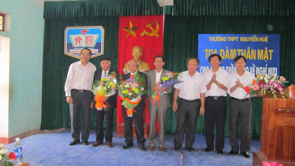 PTTH Nguyễn Huệ) - Hơn 30 năm công tác trong nghành GD với sự nỗ lực phấn đấu, sự cống hiến về trí tuệ, về sức khoẻ cho sự nghiệp trồng người, rồi đến lúc ba thầy cũng được nhận quyết định nghỉ hưu. Chiều nay thứ 7 ngày 22 - 10 nhà trường tổ chức buổi “Tọa đàm thân mật chia tay ba thầy giáo nghỉ hưu” (Thầy Nguyễn Tiến Chưởng, Thầy Hồ Nam Việt, Thầy Lê Văn Nhưng) với mong muốn tri ân sự cống hiến và đóng góp cho sự nghiệp giáo dục nói chung và nhà trường nói riêng, trước khi ba thầy về với đời thường. Dưới đây là bài phát biểu của thầy Nguyễn Tiến Chưởng đại diện cho các thầy giáo nghỉ hưu tại buổi lễ chia tay: